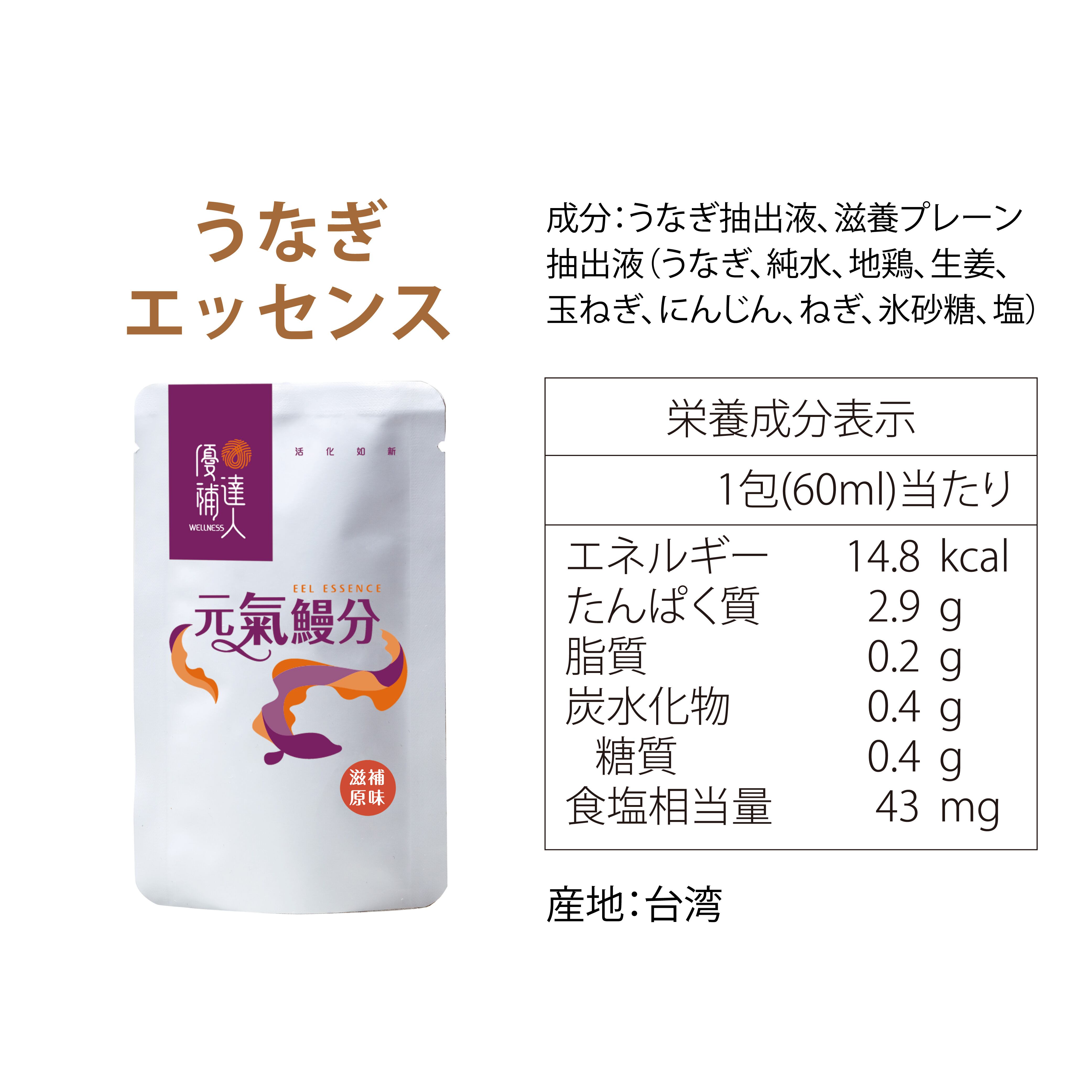 原材料名:うなぎエキス、オリジナルエキス(うなぎ、水、鶏肉、しょうが、たまねぎ、にんじん、ねぎ、氷砂糖、食塩)