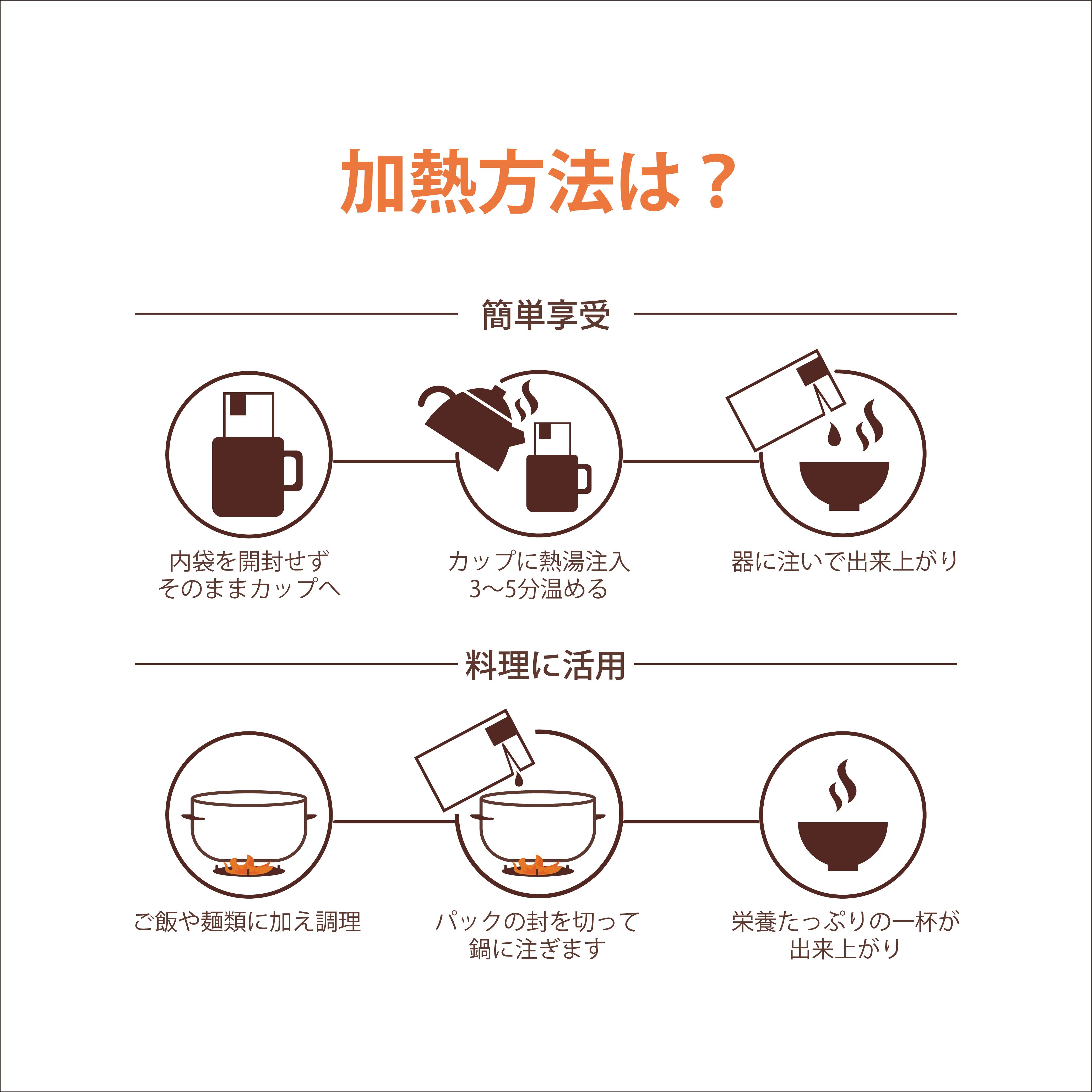 加熱方法② 袋の中身を器に移し、電子レンジで約20秒温めてお飲みください。
